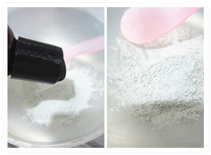 當面膜粉和精華水(沒有精華水,也能使用蒸餾水),以1小匙面膜粉配合2小匙配方份量,攪拌至像糊狀。
